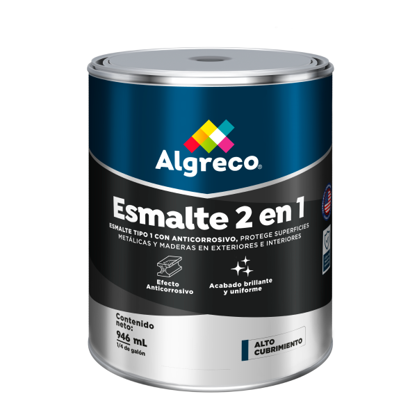 ESMALTE TIPO 1 ALGRECO es una pintura para ambientes exteriores e interiores y se aplica sobre superficies metálicas, madera, muebles, rejas, puertas, ventanas, estructuras, maquinarias, etc. que requieran baja resistencia química, no se debe usar en ambientes industriales. Se usa para la protección y decoración de superficies como metal ferroso, sobre ANTICORROSIVO ALGRECO; y sobre madera y mampostería, aplicando inicialmente SELLADOR LIJABLE ALGRECO como tapa poros.