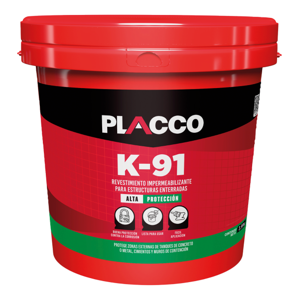 Placco K91 se usa para impermeabilizar superficies bajo tierra como tanques para agua no potable fabricados en concreto que no están sometidos a alta presión hidrostática y esfuerzos mecánicos, para cimientos, muros y estructuras que puedan estar sometidas a filtraciones, oxidación o ataque de aguas negras o muy duras. También se utiliza en el revestimiento de postes.